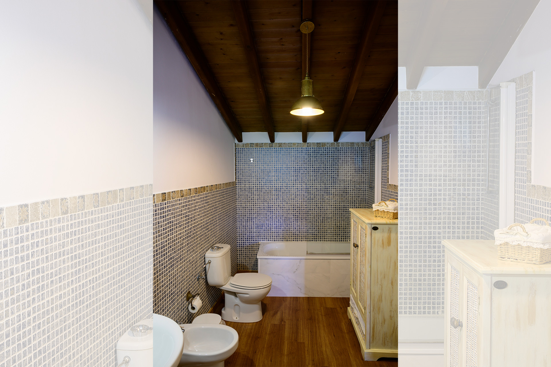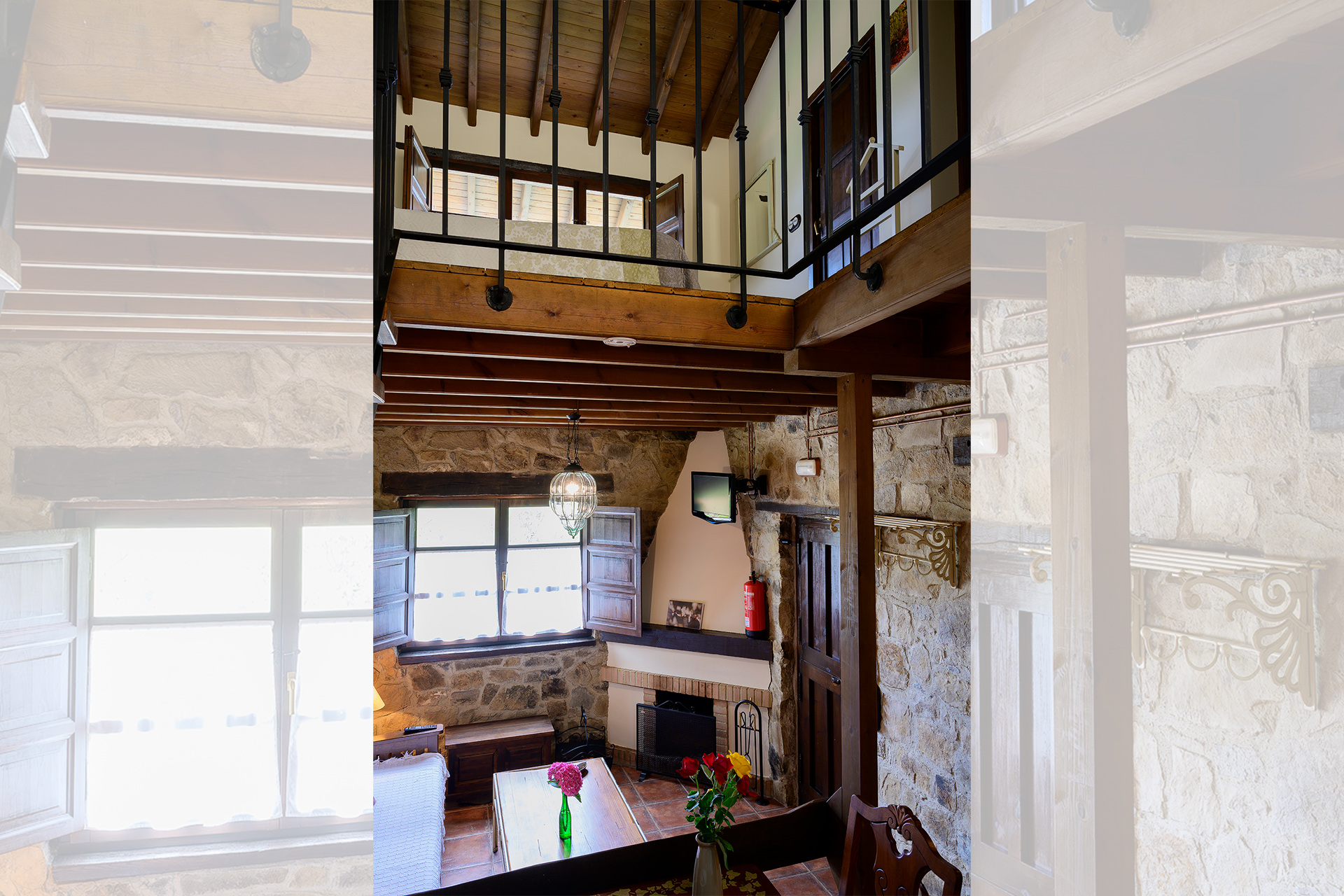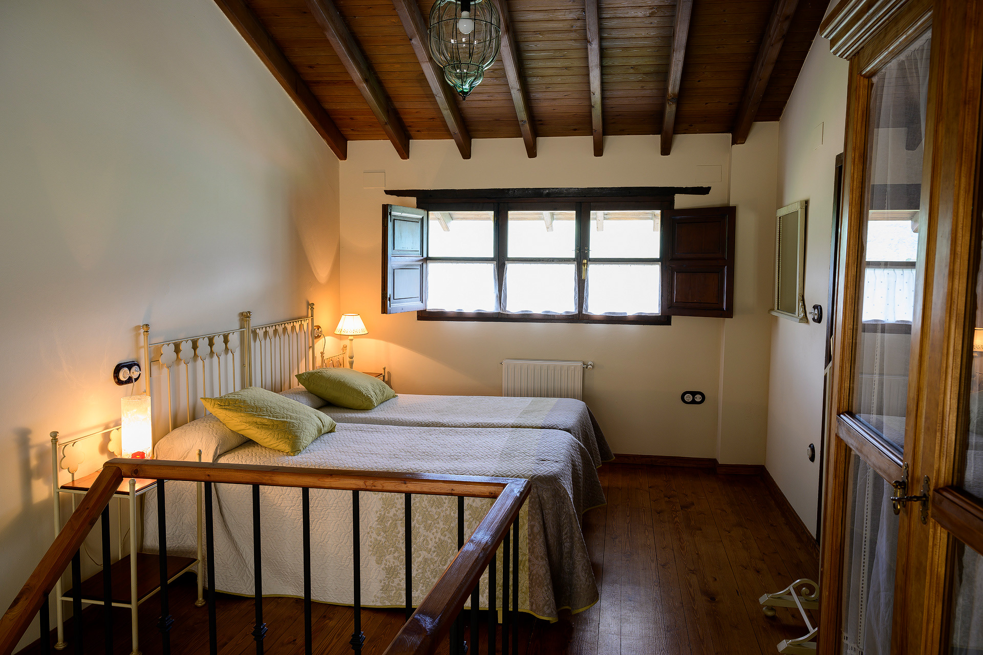 En la primera planta encontramos la habitación de techo alto con dos camas individuales de 90cm juntas y el baño completo con bañera. Desde la habitación se accede a la terraza, con vistas al fondo de valle donde se encuentra Rioseco y su embalse, y a las montañas.