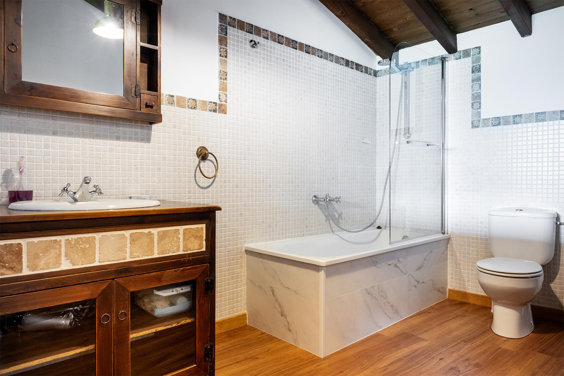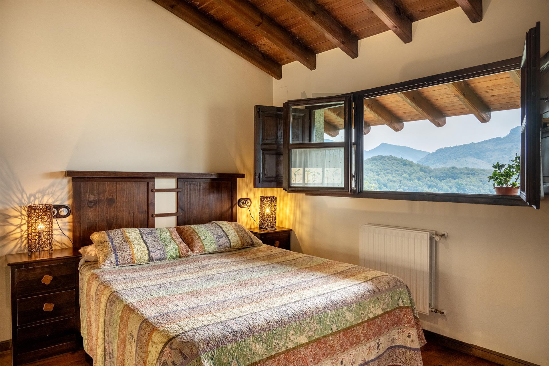 En la primera planta encontramos la habitación de techo alto con cama grande de 1,5 m y el baño completo con bañera. Desde la habitación se accede a la terraza, con vistas al fondo de valle donde se encuentra Rioseco y su embalse, y a las montañas.