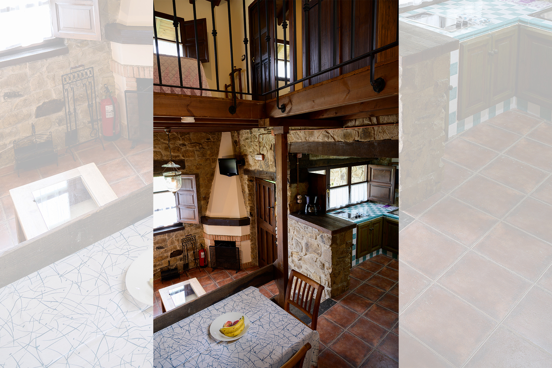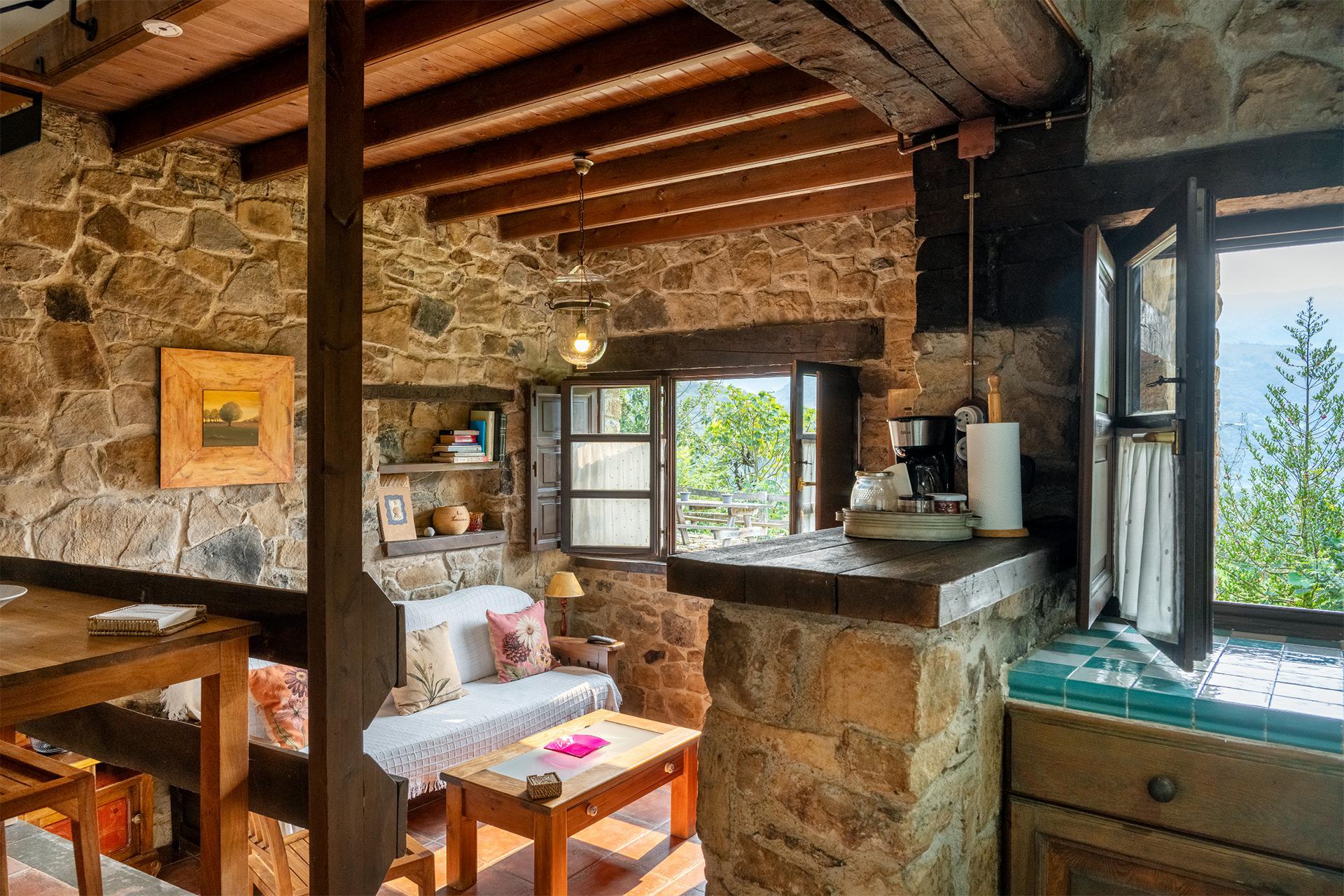 A Lluenga se accede desde una antojana independiente donde colocamos la leña para la chimenea. La planta baja la conforma un espacio abierto donde se distribuye el salón, con chimenea de leña, la cocina y la zona de comedor. También tiene aseo.